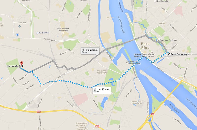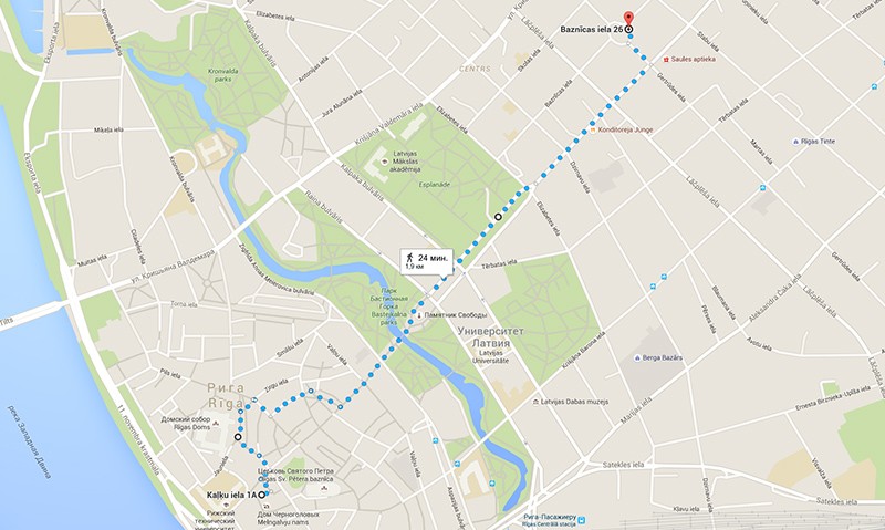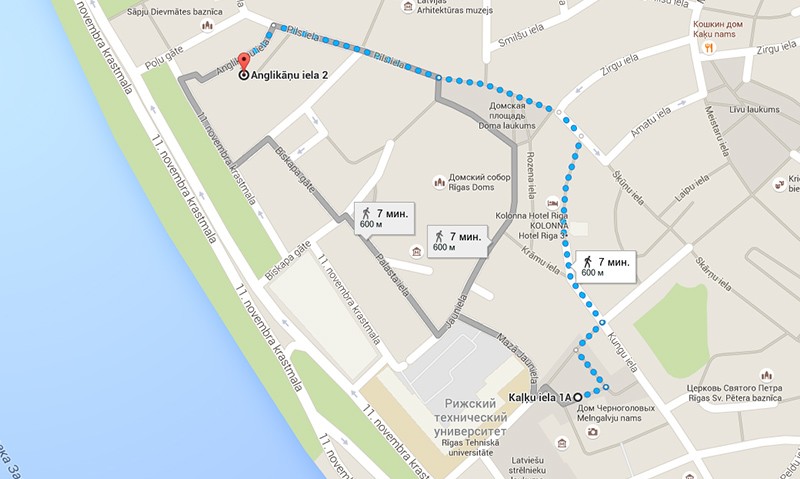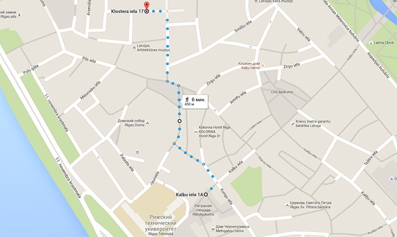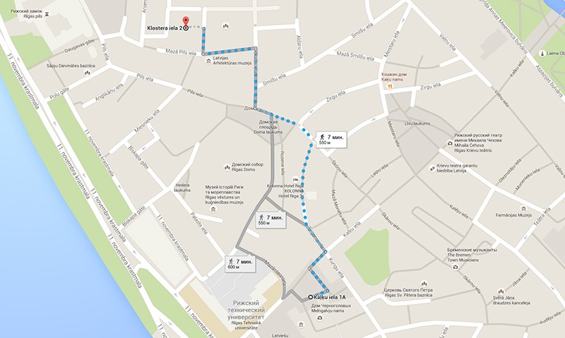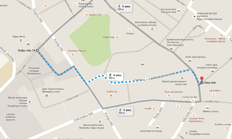 Карта предлагает вам целых три маршрута. Если боитесь потеряться, то проще всего пройти по набережной и свернуть направо на перекрёстке с улицы Польских ворот (Poļu gāte). Другой вариант — пройти по малой Новой улице (Māza Jauniela), продолжить дорогу по Новой улице (Jauniela) (да-да, никакой фантазии), а после выйти по Тиргоню или Краму к Домской площади и оттуда идти по Замковой улице (Pils iela). Маршрут стоит строить в контесте других музеев Риги, а также исторических памятников, которые вы желаете посетить.