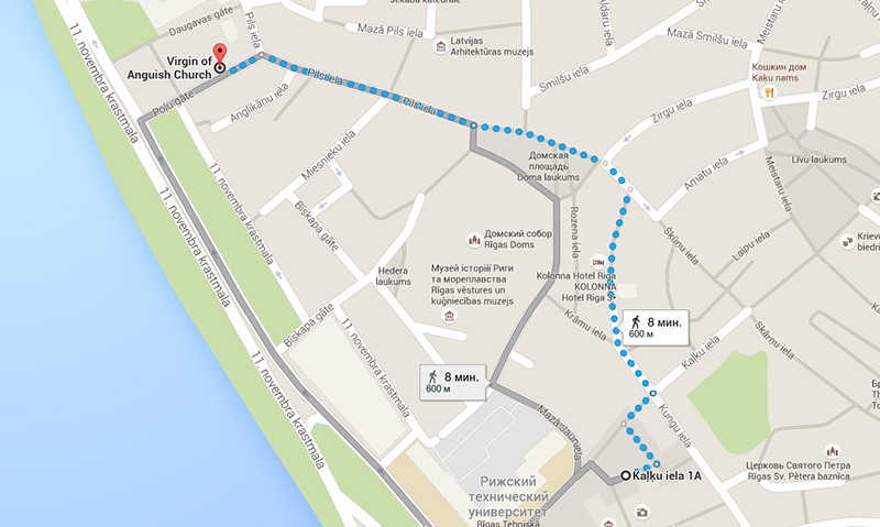 Церковь скорбящей Богоматери находится близ рижского замка на замковой площади. Если будете осматривать крепость, то определённо заметите это светло-голубое здание. Однако, раз уж мы взяли за точку отсчёта Ратушную площадь, то извольте: