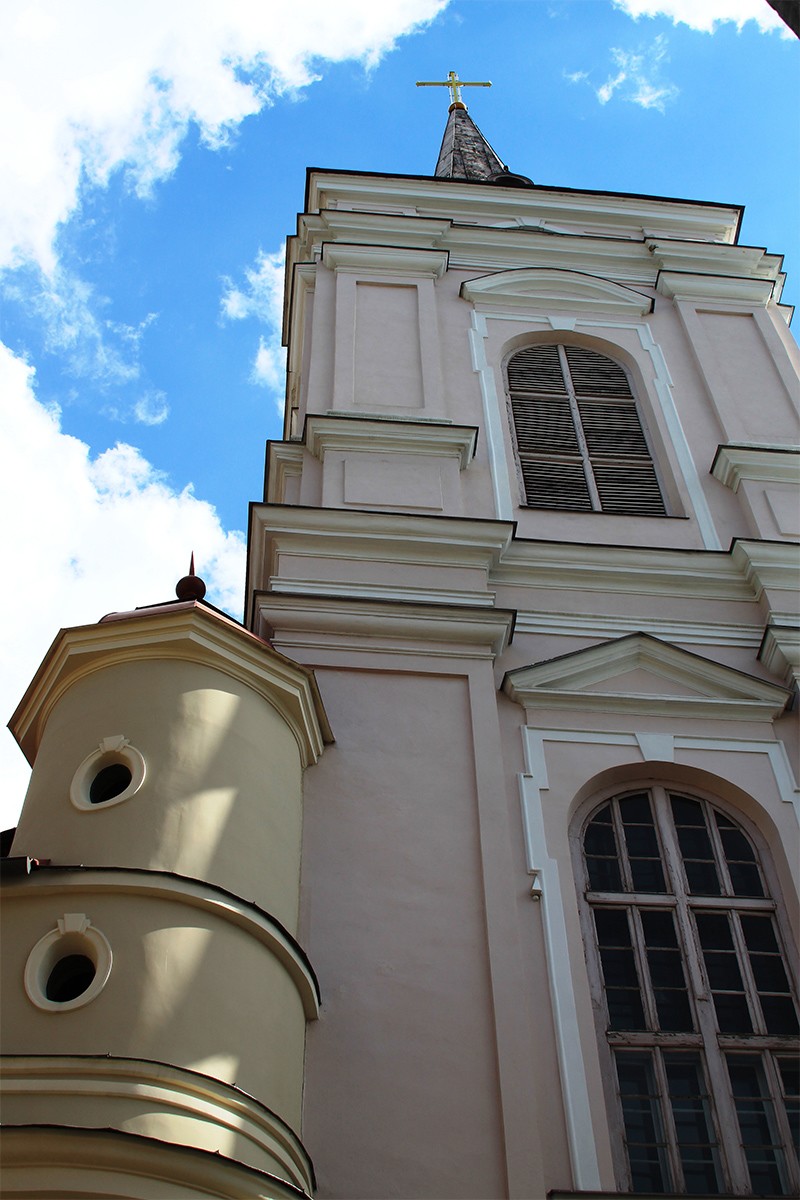 Основанная во второй половине XVIII века, церковь изначально представляла из себя весьма скромное строение, но после негодования и щедрого пожертвования эрцгерцога Иосифа II церковь принялись перестраивать. Благодаря широкому жесту августейшей особы, в церковь также принялись вкладывать деньги другие представители знати, в том числе и российской, а также зажиточные помещики. Что же, нам сейчас остаётся только поблагодарить их за возможность лицезреть это прекрасное здание, дошедшее до наших дней в своём первозданном виде. Тридцатипятиметровая красавица-кирха своей эклектичной отделкой выделяется светлым пятном в любую погоду. Нежность и сдержанность строения не внушают тех эмоций, которые некогда должны были показывать церкви. Вместо страха и напоминания о неминуемом, этот костёл скорее выглядит как уголок покоя и света.