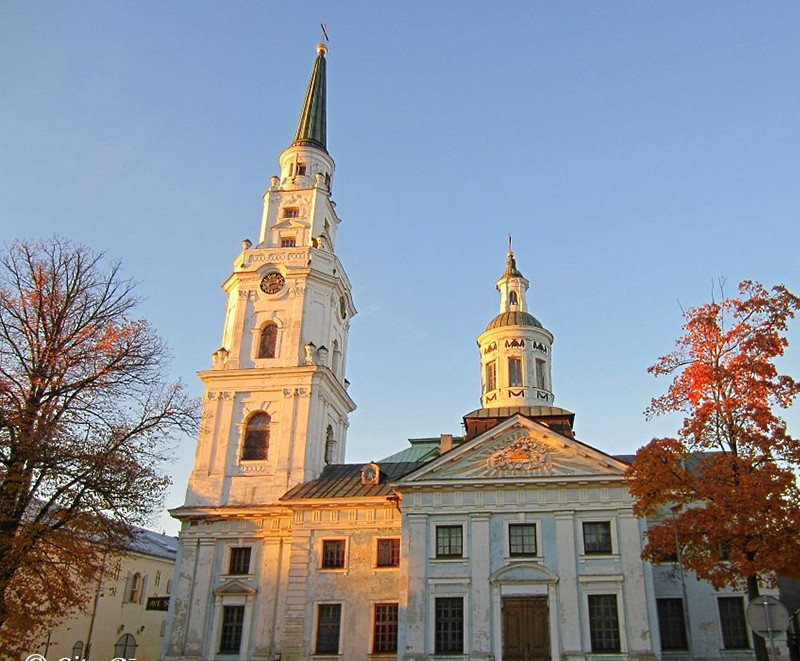 Несмотря на общий вид, который не может не завораживать, собор, тем не менее, славится, в основном своим великолепным шпилем. Ещё бы, изящная конструкция, тянущаяся в небо более чем на 60 метров, не может не привлекать внимание. Однако, как и можно ожидать, проблем эта колокольня доставила немало. Изначально шпиль был деревянным и, учитывая материал, а также время строительства (конец XV века), он продержался весьма долго, а в 1666 совсем одряхлел и рухнул. На следующий год осиротевшая церковь обзавелась новым шпилем, но тот погиб в пожаре через какие-то смешные десять лет. Это трагическое происшествие побудило отстроить новый шпиль из камня. Ещё раз после этого шпиль горел: молния ударила в слишком горделивую колокольню в 1721 году. Говорят, пожар помогал тушить сам Пётр I, но и царская рука не спасла тогда шпиль, зато Пётр же дал указ о реставрации, и к 1741 году шпиль вновь возвысился над городом. К сожалению, через две сотни лет он вновь погиб, но в этот раз от руки человеческой, пав жертвой артобстрела 1941 года.