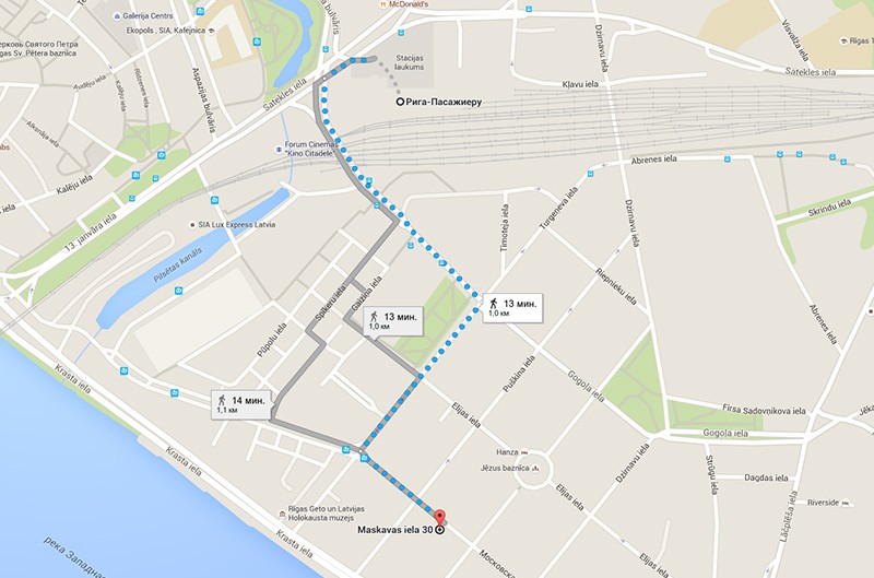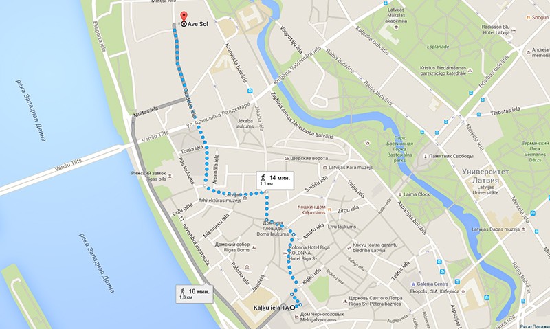 Чтобы добраться до зала Ave Sol, вам потребуется пройти чуть за Вантовый мост в сторону Тихого центра. Вы можете прогуляться по набережной и свернуть на улицу Муйтас (Muitas iela), а после пройти по улице Цитадели (Citadeles iela). Можете также пройти и через Старый Город, но потом всё равно нужно будет выйти на Цитаделес.