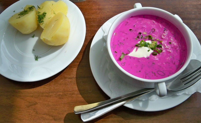- Холодный борщ (Šaltibarščiai, Шалтибаршчяй). Холодный борщ мне чем-то напомнил окрошку. Это холодный суп на кефире, в состав которого входит маринованная свёкла, зелень, овощи. Все ингредиенты нашинкованы мелкой соломкой.