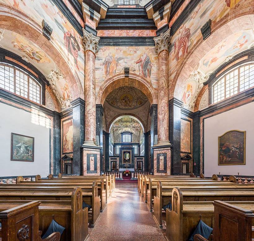 Здесь есть большой и красивый орган, великолепные скульптуры, изящные фрески, иконы, среди которых чудодейственная икона Страдающей Божьей Матери.