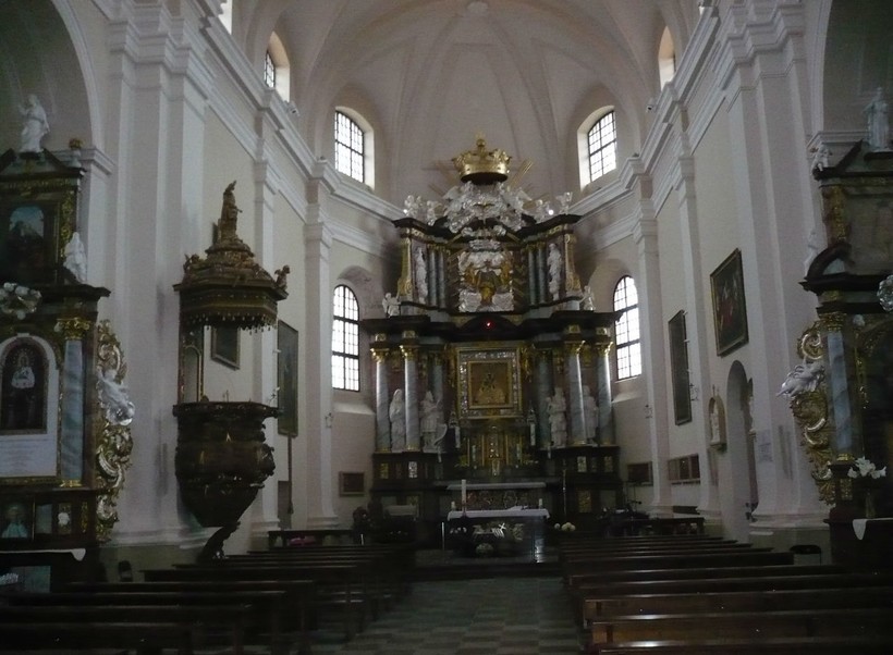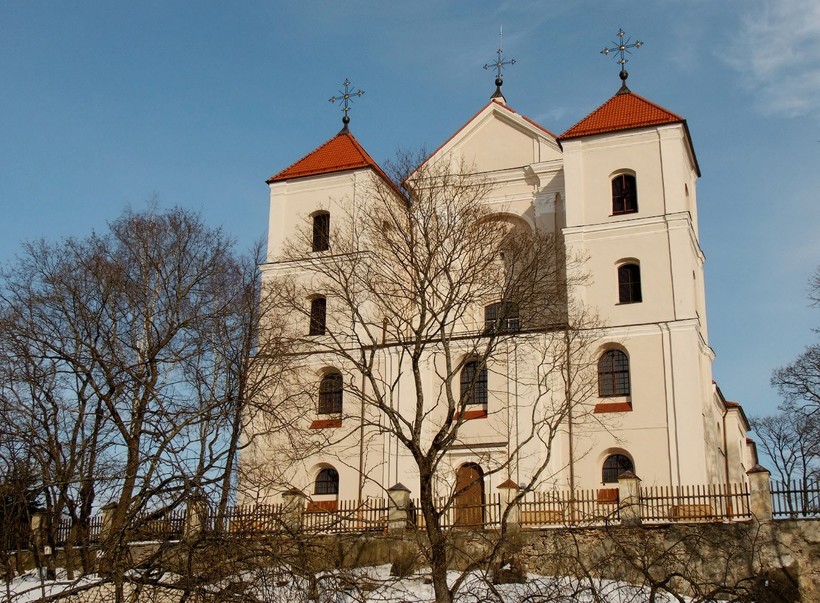 - Костел явления Пресвятой Девы Марии. Заложен он был еще в начале XV века, но свой нынешний облик обрел только три столетия спустя, когда был перестроен в стиле виленского барокко. Подробнее о нем я расскажу в пункте «церкви», пока же могу отметить, что в силу своего расположения и наличия подсветки в темное время суток костел смотрится исключительно эффектно.