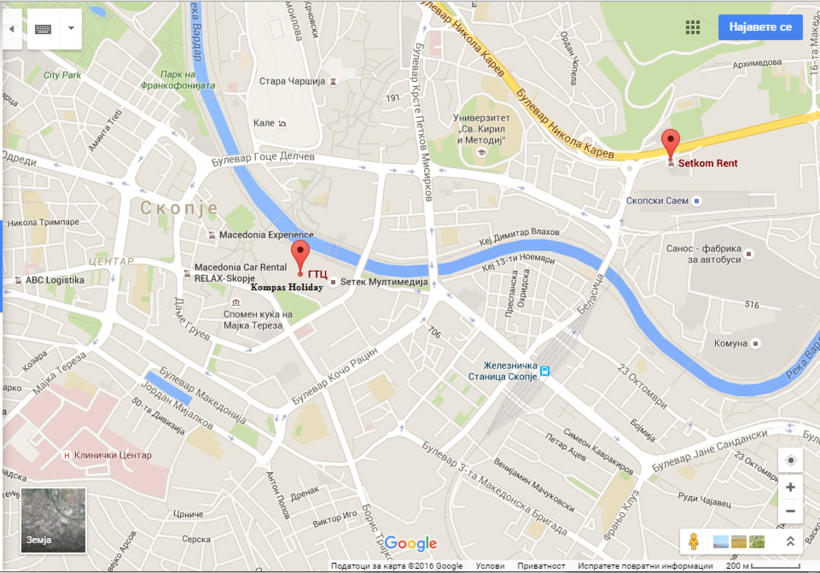 Все эти агентства работают круглосуточно. В центре Скопье в городском торговом центре ГТЦ свои услуги предлагает агентство Kompas holidays. Также в центре находится Setkom Rent.