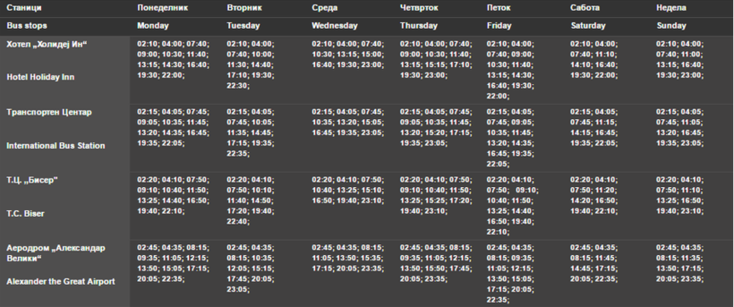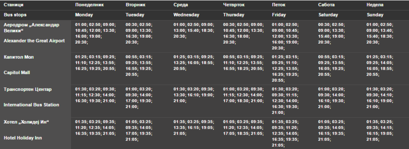 Автобусы в столице ходят не круглосуточно. Выезжают они в 05:00 утра и перевозят пассажиров до 23:00. Всего в Скопье 39 автобусных линий.