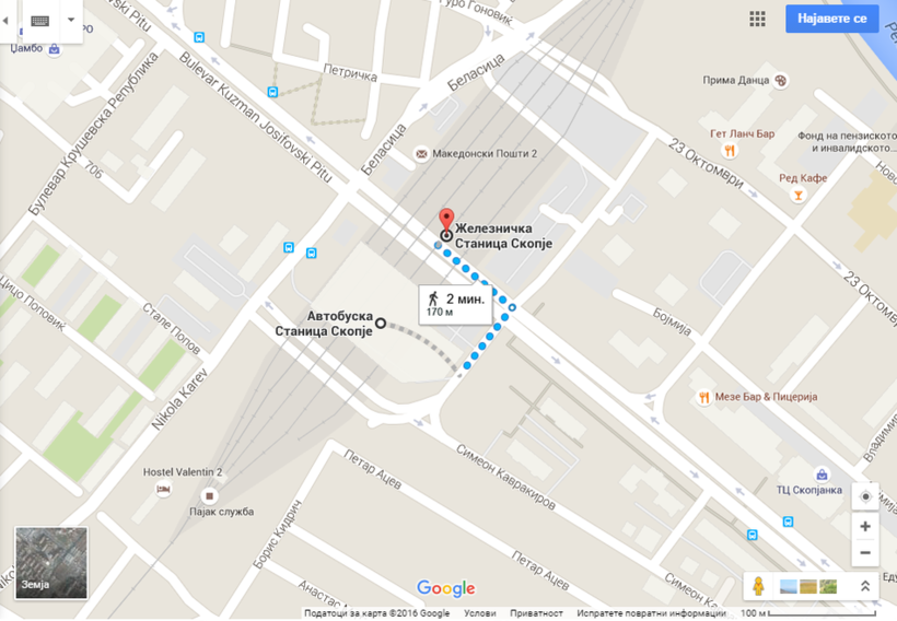 Автовокзал г.Скопье находится на расстоянии 170 метров (2 минуты ходьбы) от столичного железнодорожного вокзала. Поэтому варианты добраться до центра и до близлежащих отелей точно такие, какие я описывала в предыдущем разделе.