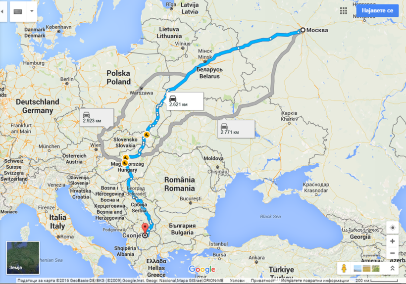 Преодолевая 2600 километров, разделяющих российскую столицу и македонскую, придется пересечь территорию Белоруссии, Польши, Словакии, Венгрии, Сербии.