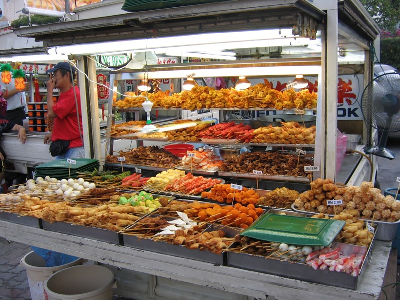 - То что русские зовут макашницы тоже попадает в категорию мамак, хотя выглядит иначе. Это большая передвижная повозка с большим количеством нанизанных на шпажки шариков, кубиков из рыбной или мясной массы, ферментированной сои. Бывают лягушки и креветки, зелень, овощи и лапша. Во многих местах можно заказать "стимбоут" – большое блюдо с набором овощей, мяса и морепродуктов и лапши. Котелок на столе кипит, вы сами варите себе суп на бульоне из того, что выбрали. К еде полагаются соусы.