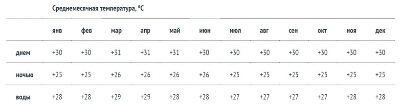 На Мальдивах не бывает изнуряющей жары из-за близости океана. Вода в среднем прогревается до +27-29 градусов, температура воздуха – до +25-30 градусов. Они практические не меняются на протяжении всего года.