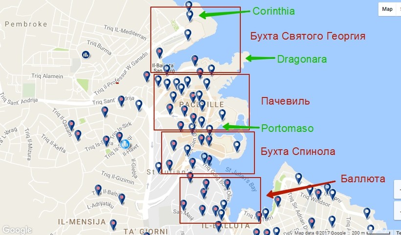 На карте отмечены основные районы города Сент-Джулианс. Самые респектабельные районы — это бухта Спинола и бухта Баллюта. Район Пачевиль очень неоднозначный, но рассмотрим все по порядку.