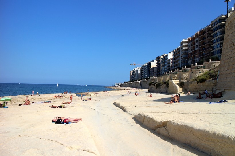 Я уже упоминала, что разделение берегов в Слиме на пляжи весьма условно: купаются все там, где получится зайти в воду. Тут есть всего один песчаный пляж и тот очень маленький, остальные представляют из себя известняковые или каменистые берега, но они довольно широкие и плоские, поэтому загорать на полотенцах достаточно удобно.