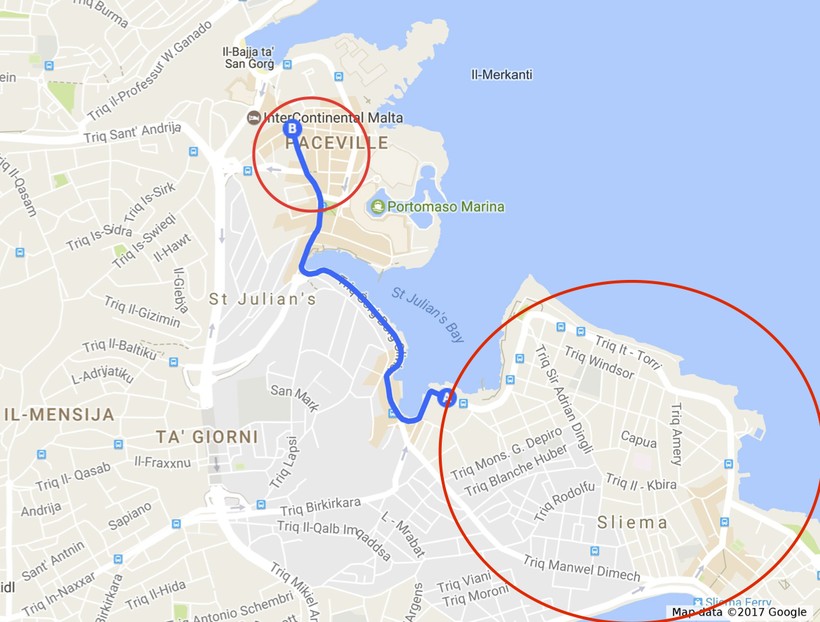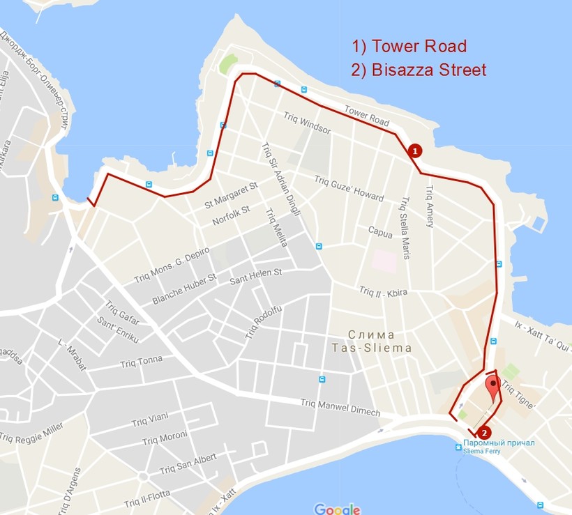 Паром прибывает в Валлетту. Из Валлетты до Слимы 15 минут на автобусе.