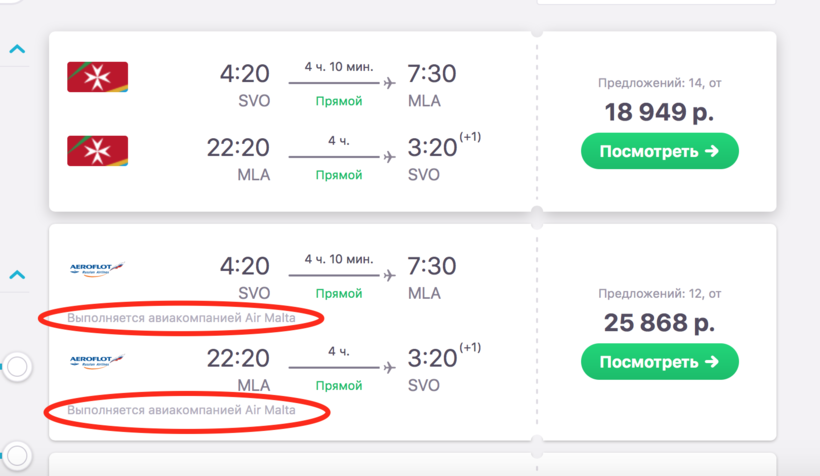 Российский «Аэрофлот» также продает прямые билеты, но будьте внимательны, мелким шрифтом пишут, что полет осуществляется Air Malta, я вот не заметила и была удивлена, что летела в итоге той же Air Malta вместо забронированного «Аэрофлота».