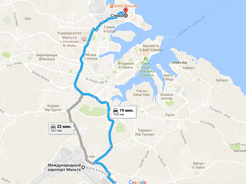 Такси дешевле всего выйдет, если скачать приложение на смартфон и заказывать машину через него, я пользовалась eCabs Malta (стоимость такси — примерно 20 EUR). Если брать такси в аэропорту, выйдет намного дороже, а время поездки составит в обоих случаях примерно 20 минут.