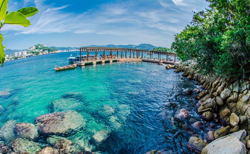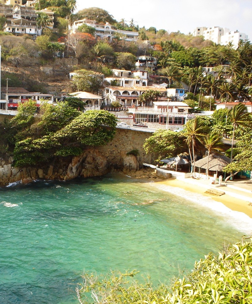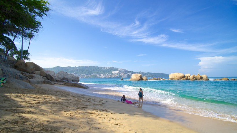 - Playas Caleta y Caletilla находятся на полуострове, в южной части бухты в центре города. Добраться сюда можно на рейсовом городском автобусе с улицы Мигель Алеман. Здесь есть бесплатные шезлонги при барах или вы можете лежать просто на песке. Пляж идеален для детей, так как уровень моря понижается постепенно. Правда, именно здесь всегда много туристов. Чистота пляжа средняя, но волн нет, а вода местами исключительно бирюзовая.