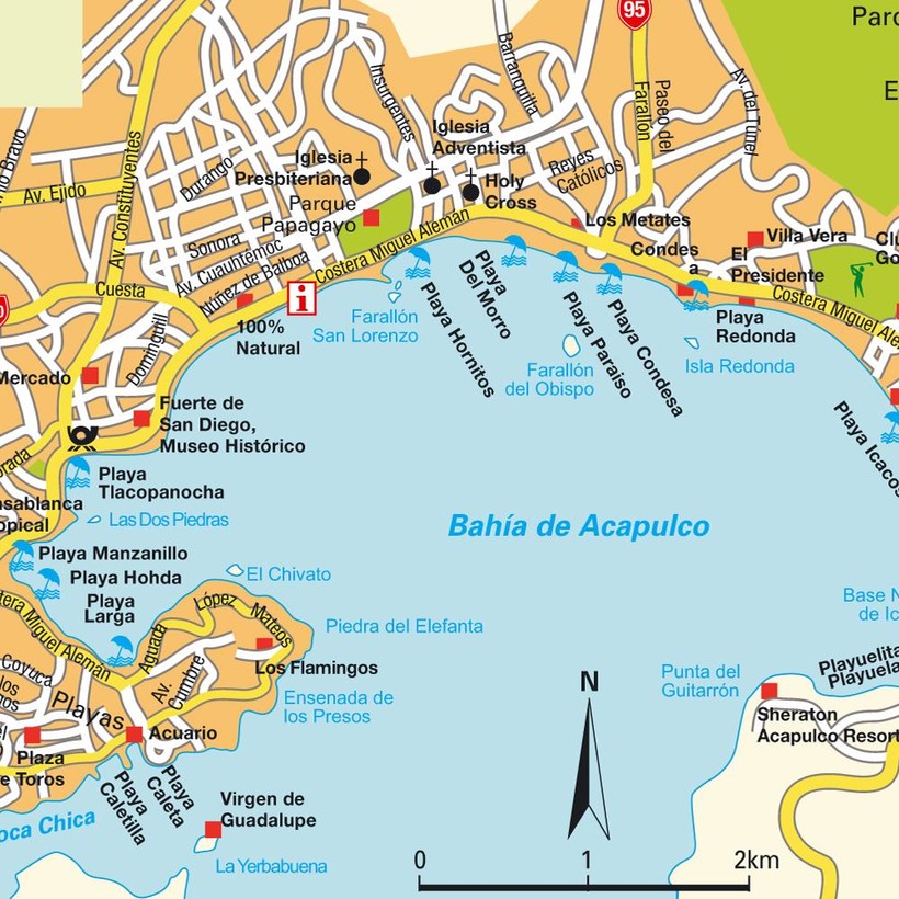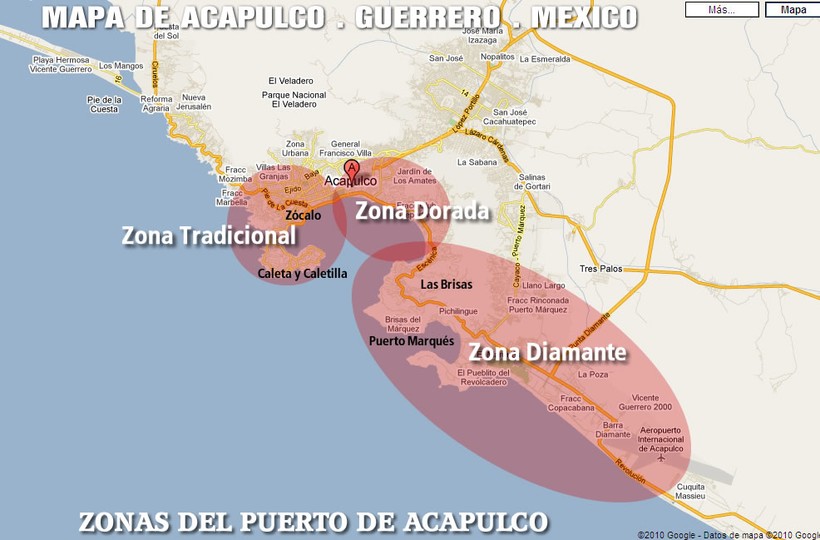 Ради безопасности туристов я советую не покидать районы, приближенные к береговой линии. Если у вас есть желание посмотреть как живут местные в Акапулько, то прогуляйтесь на север от Центра (Меркадо, на карте слева), там наиболее благополучно. На длительный срок будет достаточно комфортабельно снять апартаменты в районе Икакос или Коста Асуль (на карте справа), район же по центру бухты имеет репутацию достаточно шумного места для жизни.