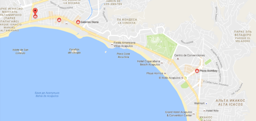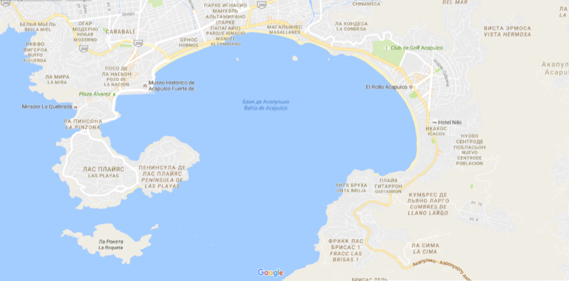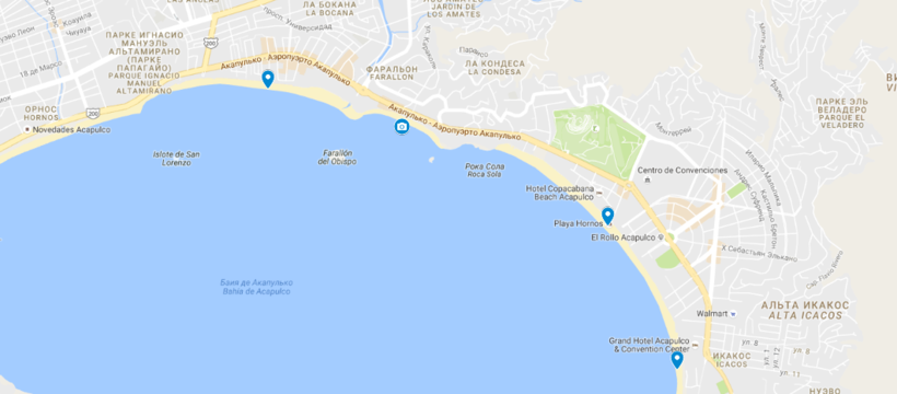 Карта главных пляжей Акапулько в центре бухты (слева направо Suites Acapulco, Condesa, Hornos, Icacos)