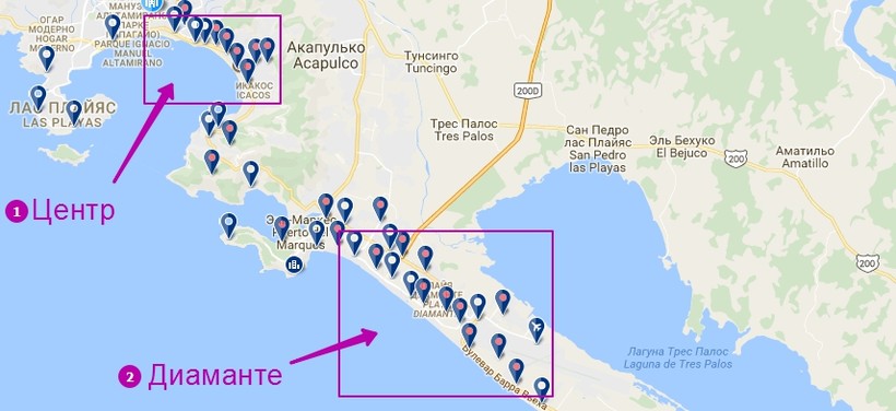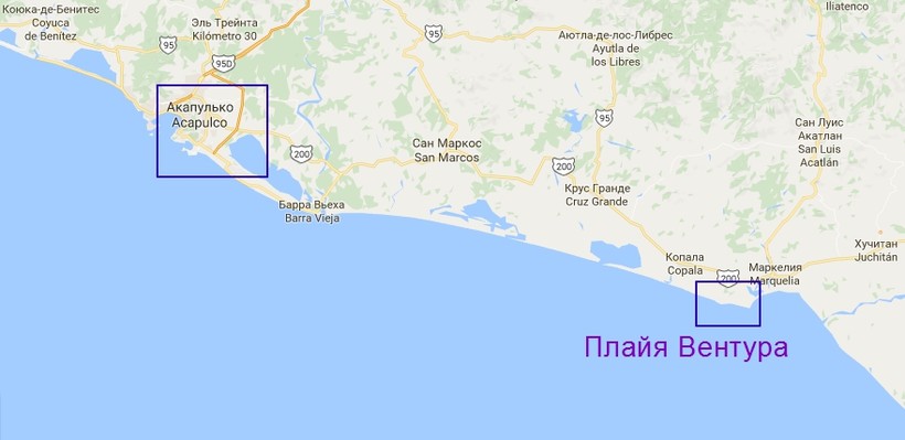 Два лучших курортных города округа Герреро отмечены на карте ниже: