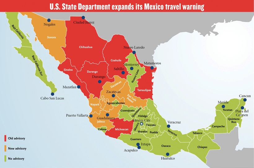 Ниже вы увидите карту регионов Мексики, оранжевым и красным на ней отмечены места, где не советуют бывать туристам по любому поводу. Регионы, озвученные нами выше, всегда зеленые.