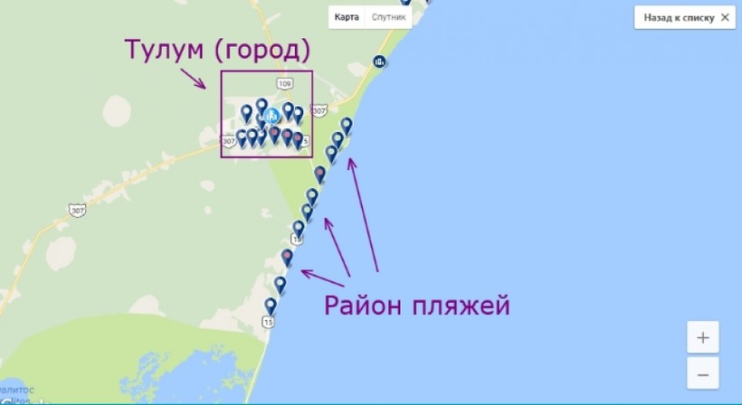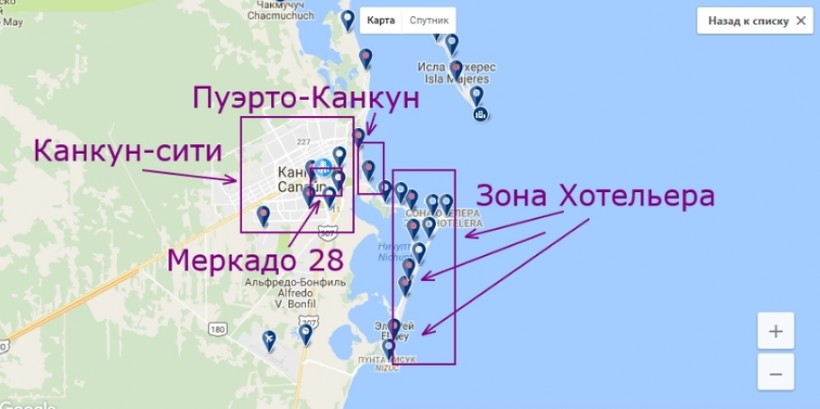 Более подробно я хотела бы остановиться на трех самых лучших курортах региона Кинтана-Роо с потрясающими пляжами и отлично развитой туристической инфраструктурой. Я показала их на карте: