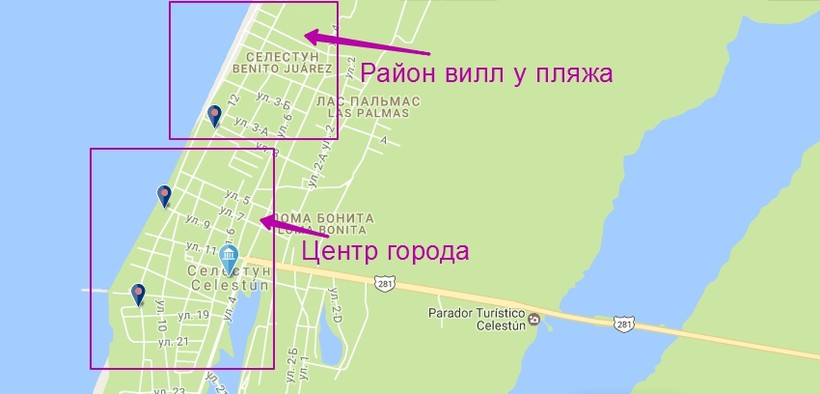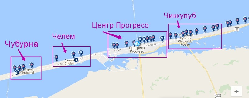 Прогресо — город-курорт для тех, кто хочет пожить в стиле Хэмингуэя на соседнем Ки-Уесте: маленький, с улицами из белого песка и достаточно широкой полосой пляжа. Уютный Прогресо имеет очень длинные пляжи, множество туристов, в основном мексиканцев, и виллы и дома, расположенные прямо на первой линии у пляжа.В самом городе часто можно встретить улицы не из асфальта, а из песка, а под пальмами, которые являются редкостью в Канкуне, в Прогресо можно лежать целый день без платы!Инфраструктура на курорте достаточно провинциальная, но вы можете легко взять в аренду шезлонг и даже столик со стульями на пляже (от 3 USD в день) для пикника.Сам пляж в Прогресо белоснежный, просто ослепительный при ясной погоде.Аренда жилья в Прогресо обойдется вам в сумму от 20 USD за обычный номер в отеле и порядка 100–300 USD в день за виллу площадью 200–300 м² на 8–12 персон. На карте выше я обозначила удачные для туристической остановки районы города.