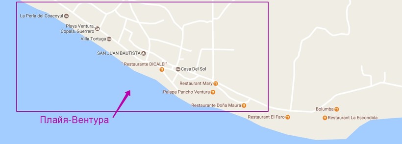 Плайя Вентура (Colonia Juan N. Álvarez) — умиротворяющий, удивительный и немного дикий. Курорт Плайя Вентура находится недалеко от Акапулько. Самое главное здесь — невероятный пляж, как будто сошедший с постера фантастического фильма о другой планете.Сам же городок чрезвычайно мал и не обустроен, но и в нем тоже есть отели, которых, кстати, не найдешь в Интернете.Обычно это несколько мини-домиков вокруг бассейна с ресепшеном и общей кухней, где можно остановиться на ночь по цене от 10 USD за номер. Большинство из них — это семейные отели, и на Booking их нет. Но у них есть официальные сайты, как этот.Пляжи в Плайя-Вентура дикие, простые, песок очень мелкий и рыхлый, светлого цвета.Шезлонг вы можете взять с собой из отеля, как и зонтик, это бесплатно. Так как все дома и отели находится в 30–50 метрах от пляжа, все так и делают. Если вы остановились в центре, то на главном пляже вас ждут шезлонги от парочки баров, которые можно арендовать по цене в 2–6 USD в день (стоит торговаться).