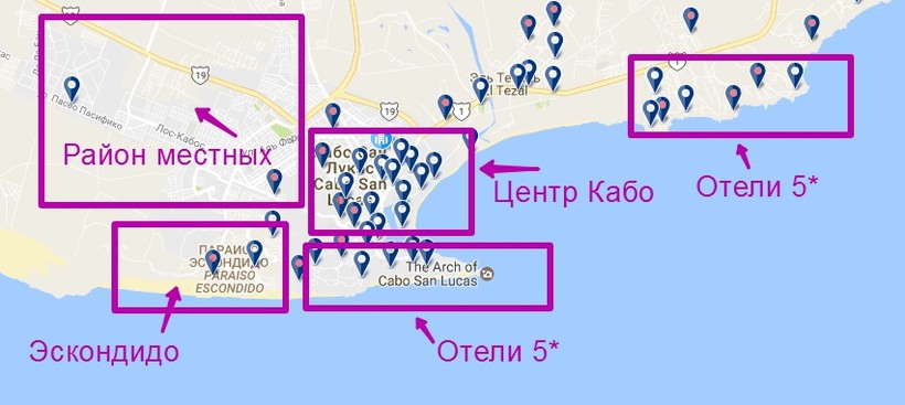 Кабо-Сан-Лукас — город с удивительной дикой природой и прогулки на катерах к потрясающим диким пляжам между скал.Курорт имеет нестандартный формат, на нем много 4*, 5* и 5*+ отелей, которые частично заняли очень много интересных пляжей. Большинство из таких больших отелей имеют ценник от 150 USD за ночь (а точнее 150–450 USD) и большие благоустроенные территории, несколько бассейнов.Несмотря на то, что Кабо заслужил репутацию очень дорогого курорта, здесь можно отдохнуть и на маленький бюджет! В районе Эскондидо и в Центре тоже можно снять квартиру рядом с пляжем подешевле — от 30–50 USD за студию или номер в дешевом отеле.Большинство пляжей на курорте имеют те самые шикарные скалы, иногда большие, иногда не очень, которыми славится сам курорт.Песок на побережье бледно-оранжевый или оранжевый. Почти все пляжи такие большие, что на них есть место и для шезлонгов, которые сдаются в аренду или принадлежат отелям, и для отдыха туристов прямо на песке.