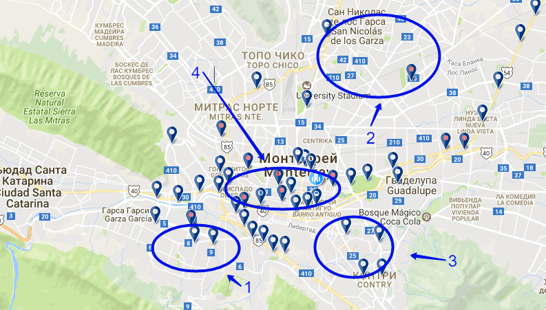 То есть формально Монтеррей — это небольшой город в центре, окруженный другими городами: Сан-Николасом, Сан-Педро, Санта-Катариной и так далее. Я же, для удобства восприятия, буду называть эти небольшие города районами.
