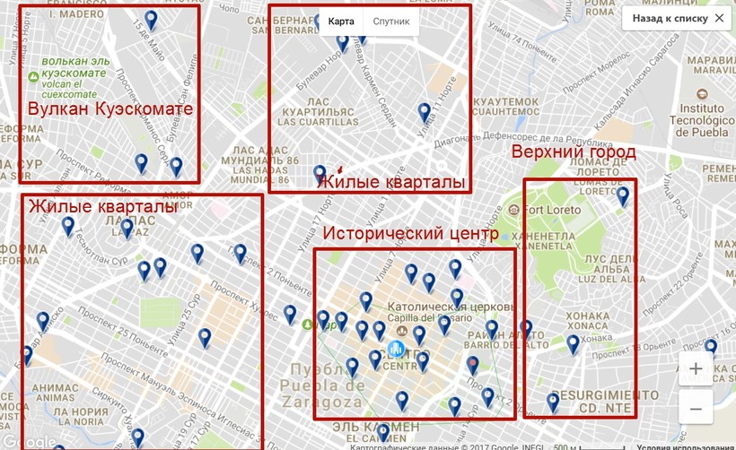 Пуэбла состоит из сотен крошечных кварталов, каждый из которых имеет свое название, и пытаться запомнить их все вовсе необязательно. Поэтому ниже на карте я разбила город на условные участки.