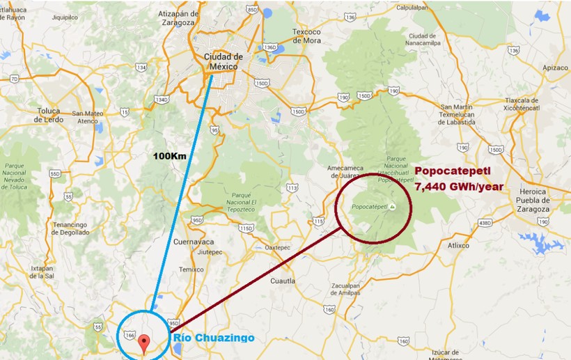 Ниже вы можете видеть карту Мексики с обозначенными на ней городами Мехико-сити, Амекамека (возле вулкана) и вулканом Попокатепетль. Также отмечено таяние ледников с вулкана и река, в которую впадают талые воды.
