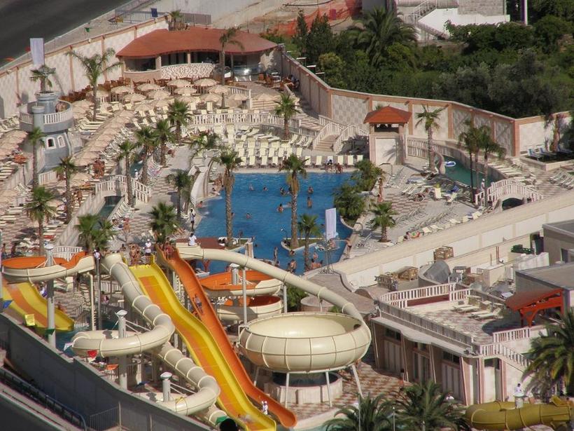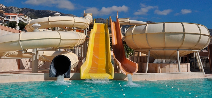 Здесь работает 10 горок, 2 из которых подходят только малышам, а на остальных могут кататься и взрослые, шесть бассейнов, теннисный корт, площадки для загара, кафе и т.д.