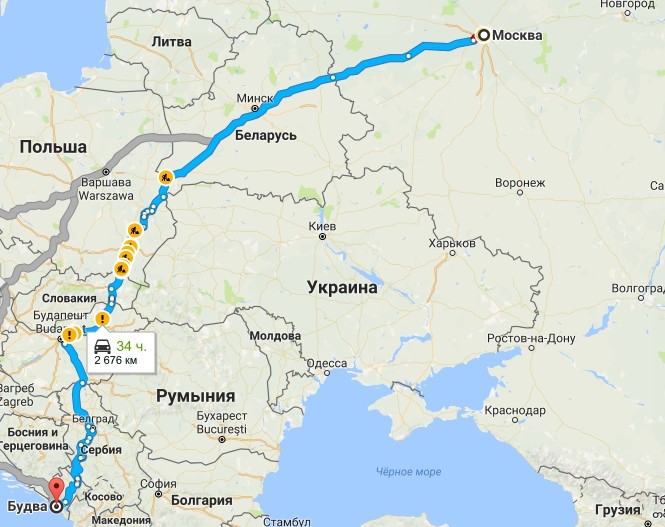 Вы преодолеете путь Москва — Минск — Польша (без заезда в столицу – Варшаву) — Словакия (опять-таки, в столицу вы не попадаете) — Венгрия — Сербия — Черногория. Советую вам перед поездкой посмотреть в навигаторе, по каким именно трассам ехать, чтобы не было никаких дорожных работ или, в худшем случае, временно закрытых магистралей.