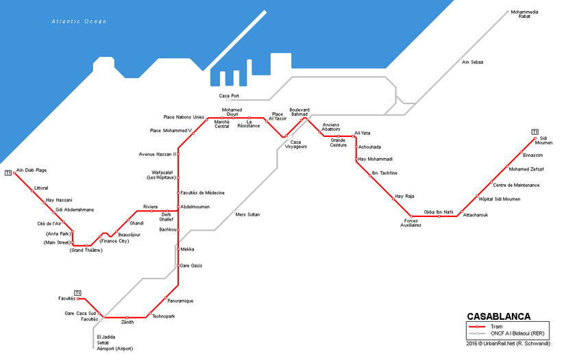Ближайшая к пляжу Plage Ain Diab станция называется Ain Diab, также есть станции в порту (Casa Port) и рядом с железнодорожной станцией (Casa Voyagers). Трамваи работают с 6 утра до 22 часов 30 минут вечера. Проезд стоит 0,5 USD и оплачивается в дирхамах (6 MAD). Оплата производится на турникетах возле каждой станции. Сначала покупаете билет в автомате. Потом, чтобы пройти турникет, проводите билетом в обозначенном месте (как в метро). Принимаются только монеты, без купюр.
