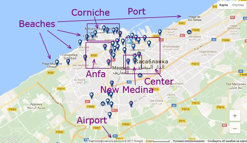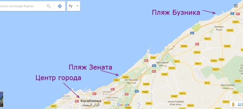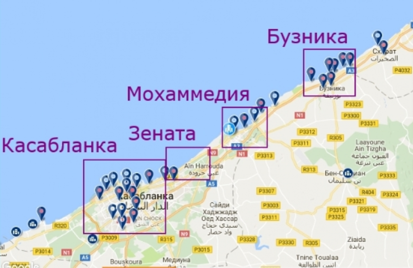 Карта популярных районов за городом (Зената, Бузника и Мохаммедия):
