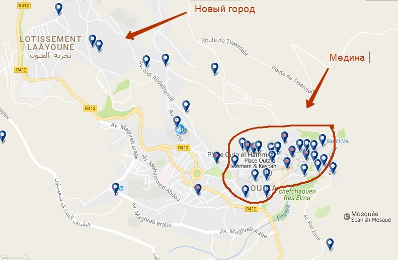 Шефшауэн, как и многие города Марокко, состоит из старого и нового города. Старый всегда называется Мединой, а вот новый такой уж новый, что и имени у него своего еще нет.