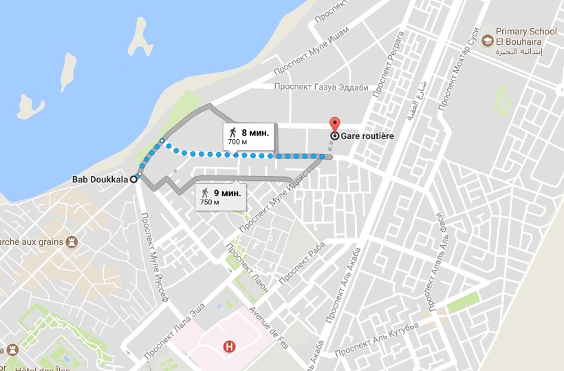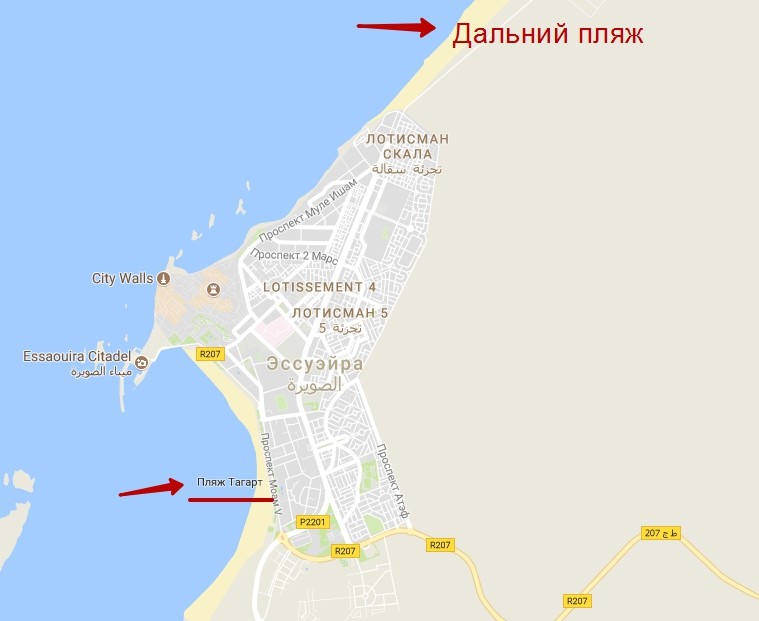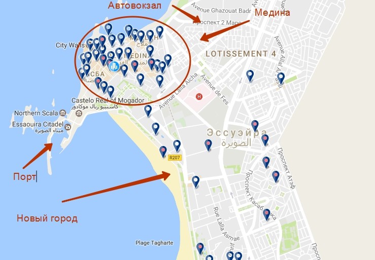 Пребывает любой автобус на единственный автовокзал города, а оттуда в 700 м и океан как на ладони, и Медина, и все радости славной Эсауиры. Такси вам не потребуется, а прогуляться пешком будет самое то: заведете новые знакомства, расспрашивая, как отыскать нужное вам место, и начнете мало-мальски ориентироваться в городе.