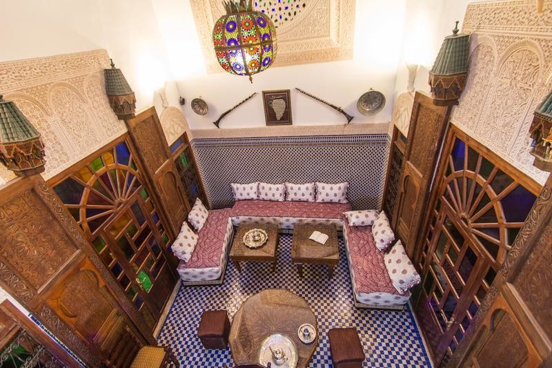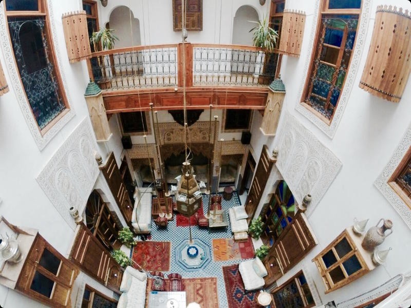 Вторым оказался Riad Verus. Он расположен вне новой Медины, но близ нее. Тоже спрятан и тоже не примечателен, если судить по входной двери. Зайдя внутрь, действительно оказываешься во дворце. В марокканском великолепном дворце. В патио журчит фонтанчик, тебя угощают мятным чаем и ты знакомишься с новыми интересными людьми. Этот Riad очень атмосферный, с огромной террасой и видами на весь Фес, с роскошными завтраками и классными гидами по старой Медине всего за 5 EUR с человека. Одна ночь в таком риаде стоит 8 EUR. Ко всем плюсам дворца был один колкий минус – плохой музыкальный вкус хозяина, который с утра до ночи включал техно. Но за все это время сменилось столько гостей, но осталось не меньше мнений, что этот минус уже давно мог перерасти в плюс. В общем, рекомендую.