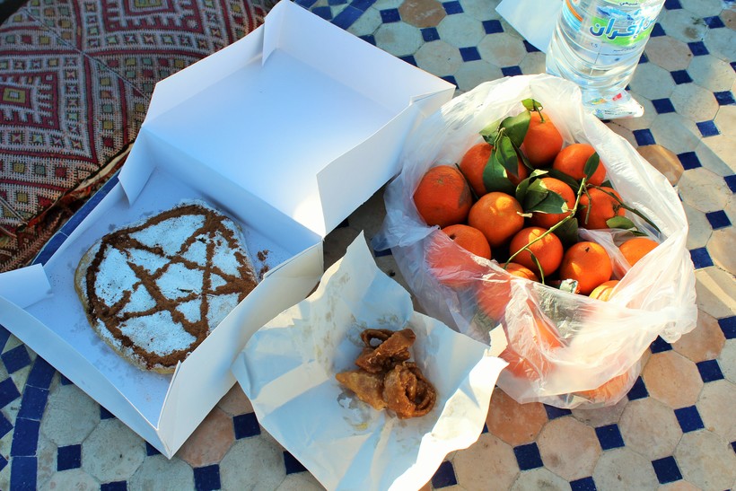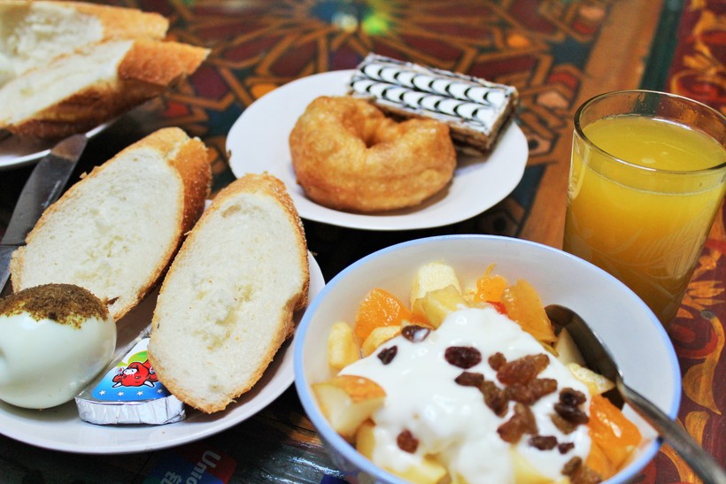 Один из типичных марокканских завтраков состоит из фруктового салата с йогуртом, батона с сыром и яйцом со специями, плюшки и пирожного, так похожими на наши советские сладости, свежевыжатого апельсинового сока и мятного чая. В другом варианте завтрака могут встретиться маслины с оливками и отменный марокканский хлеб. Такие завтраки часто сервируют и в хостелах.