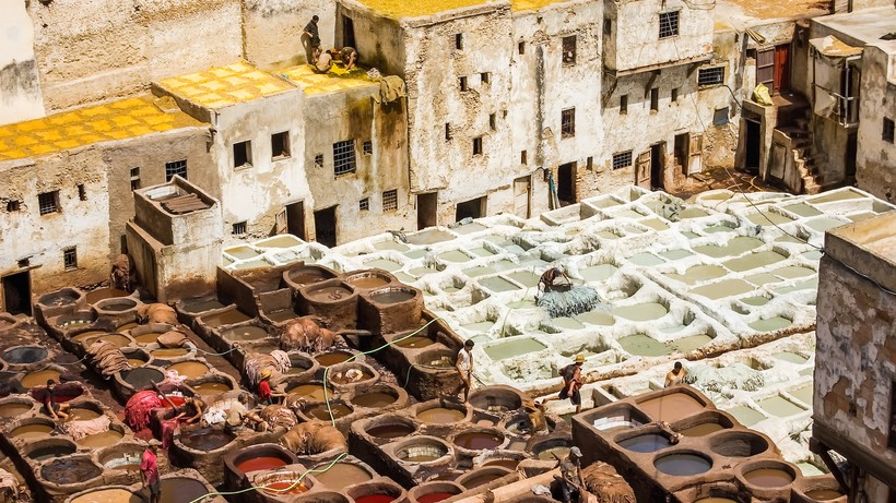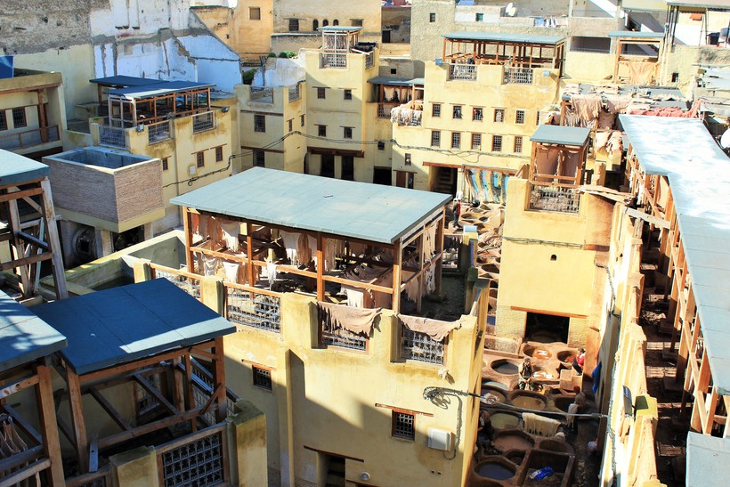 Но самое потрясающее достоинство Феса – его красильни, где сгорбленные кожевники древним способом обрабатывают и окрашивают кожу, стоя по колено в чанах, полных разнообразных жидкостей. Техника окрашивания кожи следующая: сперва кожу обрабатывают, замачивая ее в известковых ваннах, а затем в растворе птичьего помета, а после этого долго полощут кожу в краске и в заключении оставляют ее на просушку. Вся краска исключительно натуральная: из хны, куркумы и прочих полезных средств.