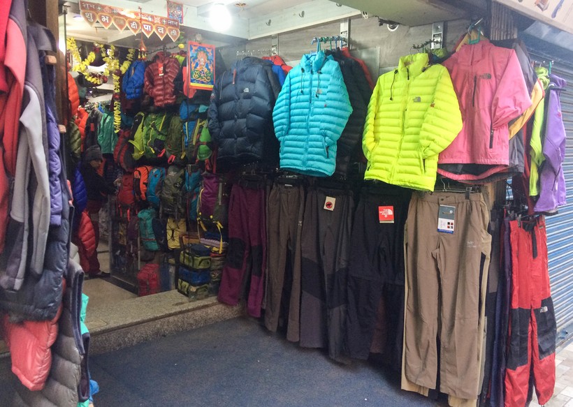 Пуховые куртки, водонепроницаемые штаны, флисовые кофты и шапки, рюкзаки, спальники, трекинговые палки, ботинки, очки, термобельё… Там есть просто всё. На большинстве вещей надпись North Face или, на худой конец, Marmot. А цены! Таких вы не найдёте ни в одном магазине в самый пик распродаж, а всё потому, что одежда и товары эти ненастоящие. Думаю, на наших рынках вы видели вариации надписей на тему Adidas и тому подобных. А вот в Непале любят подделывать товары для походов. North Face — популярная и хорошая марка в этом сегменте.