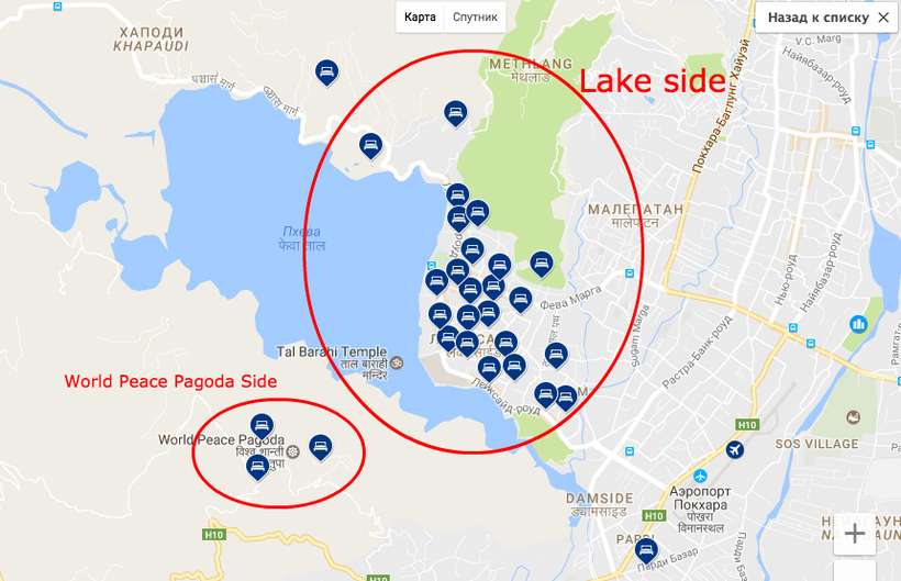 Покхара — город не самый маленький, но туристический район в нем только один и называется Lake side, что в дословном переводе означает «на стороне озера». Красивейшее озеро Фева — это то, ради чего все приезжают в Покхару, поэтому именно здесь сосредоточены все отели. Чем ближе к озеру, тем дороже соответственно. Развитая инфраструктура только на правом берегу, это и есть район Lake Side, который предлагает на выбор более 200 отелей и гостевых домов.