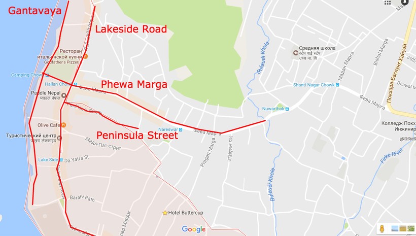 Gantavaya Street — променад вдоль озера, а значит самая важная улица Покхары. Она довольно протяженная: примерно 40 минут ходьбы прогулочным шагом в одну сторону. Вдоль улицы сплошной линией стоят симпатичные кафе. Много продавцов кокосов, выпечки и странного непальского фаст-фуда в виде сухих зерен, перетертых со свежим репчатым луком.