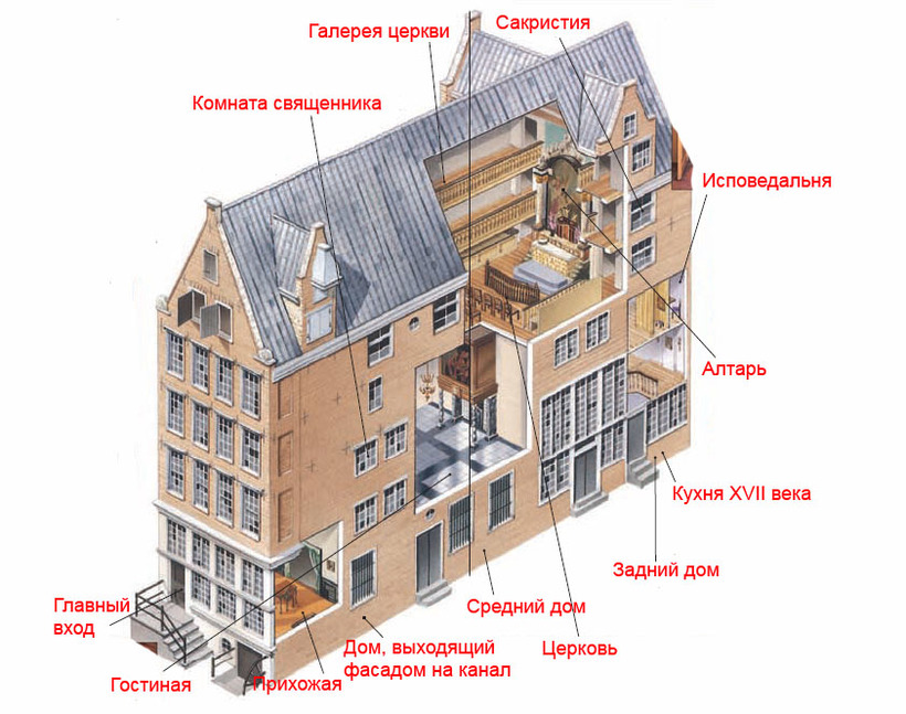 - Потайная церковь в квартале красных фонарей Церковь нашего возлюбленного Господа на чердаке, Ons lieve heer op solder, (Oudezijds Voorburgwal 38) также находится посреди Квартала красных фонарей. В XVII веке католицизм преследовался властью, и один деятельный купец основал внутри трёх сращенных между собой домов этот приход. Церковь выглядит впечатляюще внутри, а снаружи имеет вид обычного дома.