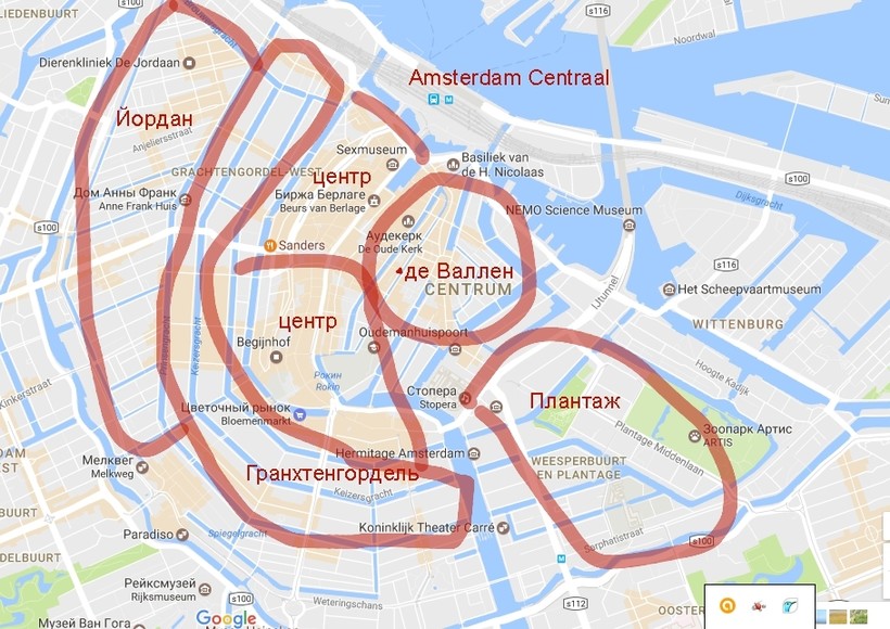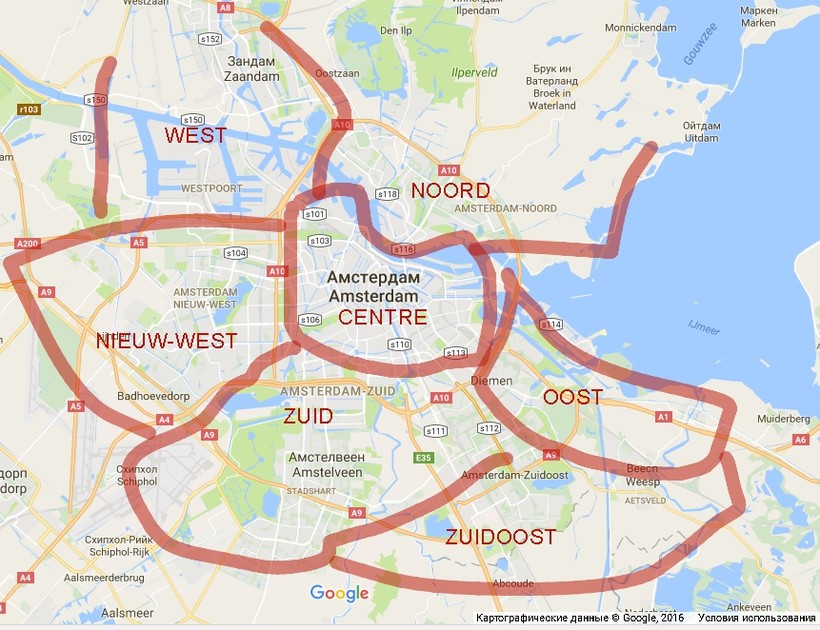 В настоящее время Амстердам состоит из 7 районов, увидеть которые можно на карте ниже. В их число входят: