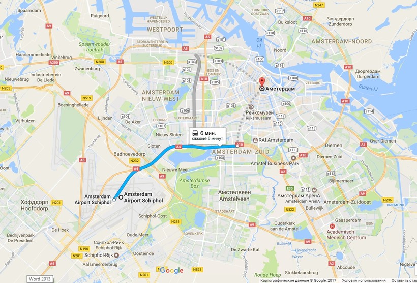 Из Схипхола до Амстердама ходит аэроэкспресс (такие же комфортабельные двухэтажные вагончики как и до пригорода). Стоимость билета составит 9 EUR на человека. Время в пути ориентировочно 15 минут. Можно добрать на такси от 45 до 60 EUR в зависимости от количества человек.