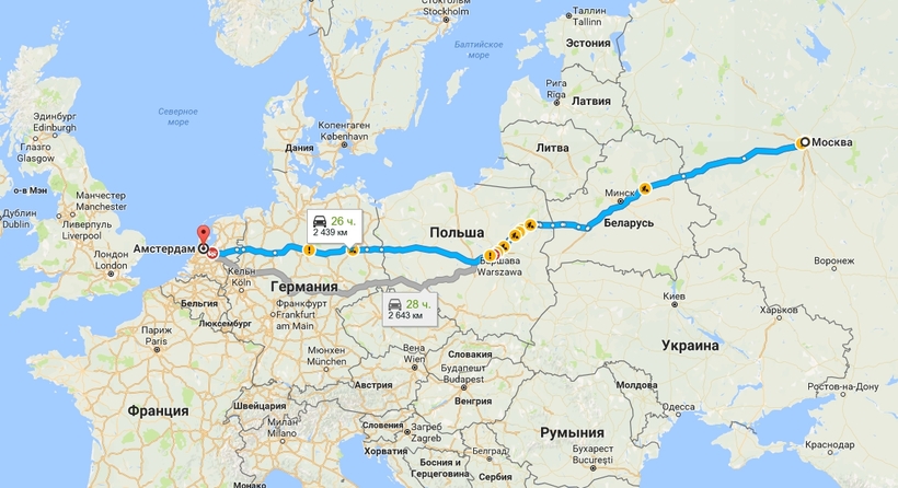 Из Москвы вы въезжаете в Белоруссию, где придётся постоять на границе с шенгенской зоной — Польшей. Очередь там может достигать от 3 до 12 часов, поэтому возьмите перекус и мелкие деньги. Гринкарту, кстати, можно оформить на месте. Не забудьте прогуглить вопрос оплаты дороги в Польше, Германии, Нидерландах. Кажется, вы просто видите перед собой шлагбаум и без монетки и выданного чека (виньетки) не проедете дальше.