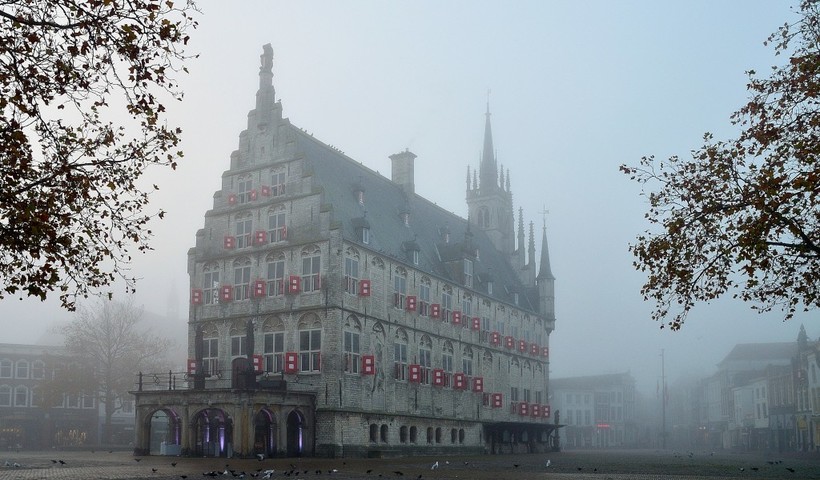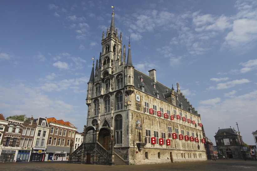 - Ратуша Гауды. При пожаре первой половины XV века старое здание ратуши пострадало больше всего, поэтому было решено построить новое, но на том же месте. В 1450 году новое здание в готическом стиле было завершено и стало одной из нескольких самых главных достопримечательностей города. С одной его стороны можно увидеть куранты с механическими фигурками, центральное место среди которых занимает изображение Флориса V, много веков назад предоставившего Гауде права города. Сегодня можно пройтись внутри здания за небольшую плату — 2.50 EUR. Во время сырной ярмарки здание тоже открыто, и за 5 EUR вы можете зайти на террасу и выпить чашечку кофе с традиционной голландской вафлей.