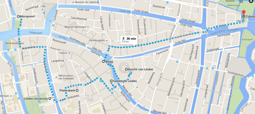 Все самое интересное на карте обозначено синим цветом. Конечно, очень хочется отель в центре, прямо на набережной канала, выйти утром на балкон, посмотреть на красивые домики вокруг, умилиться проплывающей лодочке, помахать рукой проходящим мимо студентам. Но поверьте мне, даже если вы снимите апартаменты где-нибудь на севере или юге, ваше утро от этого не станет менее прекрасным. Максимум за 15 мин на автобусе вы уже будете в окружении исторических зданий, перед воротами Ботанического сада Лейденского университета.