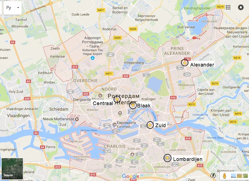 - Стоит обратить внимание на район Prins Alexander — самый восточный и один из пяти крупнейших районов. Он был организован для расширения границ города, сюда доходят две линии метро (А и В) и станция железной дороги Rotterdam Alexander. В районе расположился крупный торговый центр Alexandrium (рай для шопоголиков) и несколько парковых зон, в том числе озеро и городской пляж Nesselande, где приятно отдохнуть летом. Отелей здесь немного, но они предлагают номера по разумным ценам, а до центра города вы доедете на метро всего за 20 минут.